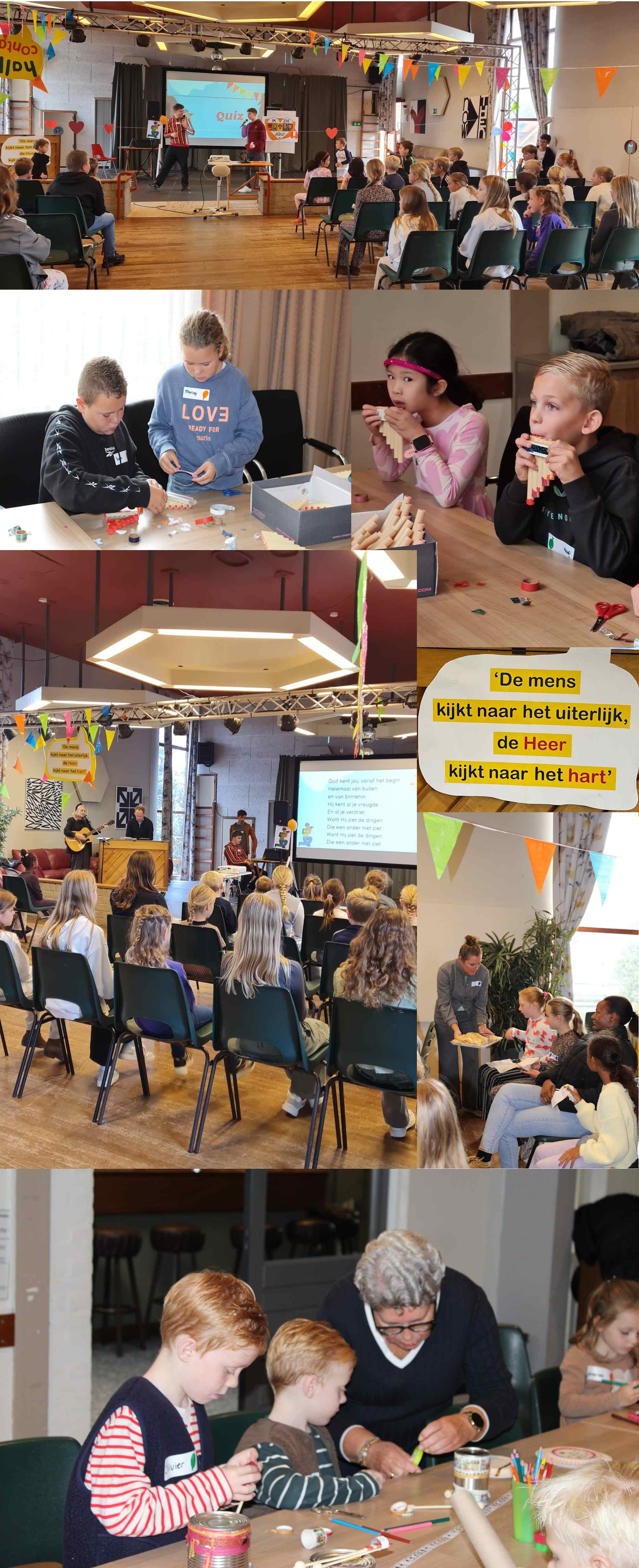 Overal in ‘t Centrum ballonnen met oogjes, brillen en kijkers; het was duidelijk dat het thema iets met ‘zien’ te maken had. We hoorden het verhaal over David die tot koning gezalfd wordt door de profeet Samuël. Niet zijn grote sterke broer, maar hij als jongste van het gezin mag koning worden. Waarom? ‘De mens kijkt naar het uiterlijk, de Heer kijkt naar het hart.’ Van David wordt verteld dat hij harp speelde en muziek maakte. Daarom hebben we muziekinstrumentjes gemaakt, waar zondag bij de dienst ook op gespeeld gaat worden.