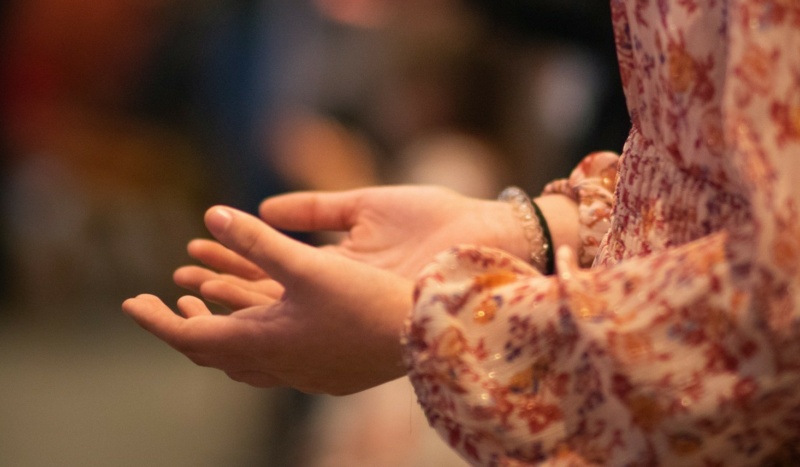 Na de dienst zijn er twee mensen, die samen voor iemand bidden. Gebed vindt plaats op een rustige plaats in de open ruimte van het kerkgebouw. Dit geeft veiligheid, maar ook een open sfeer.