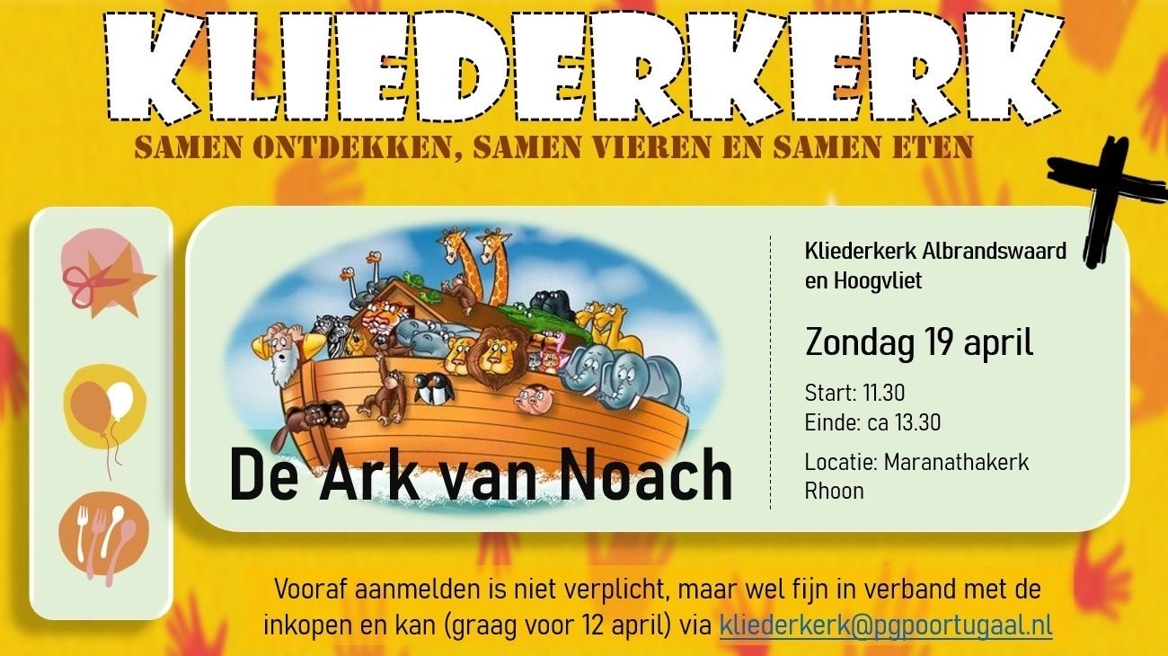 Kliederkerk wordt gehouden in de Maranathakerk, Kleidijk 2B in Rhoon. Vooraf aanmelden is niet verplicht, maar wel fijn in verband met de inkopen en kan via kliederkerk@pgpoortugaal.nl (graag voor 12 april)