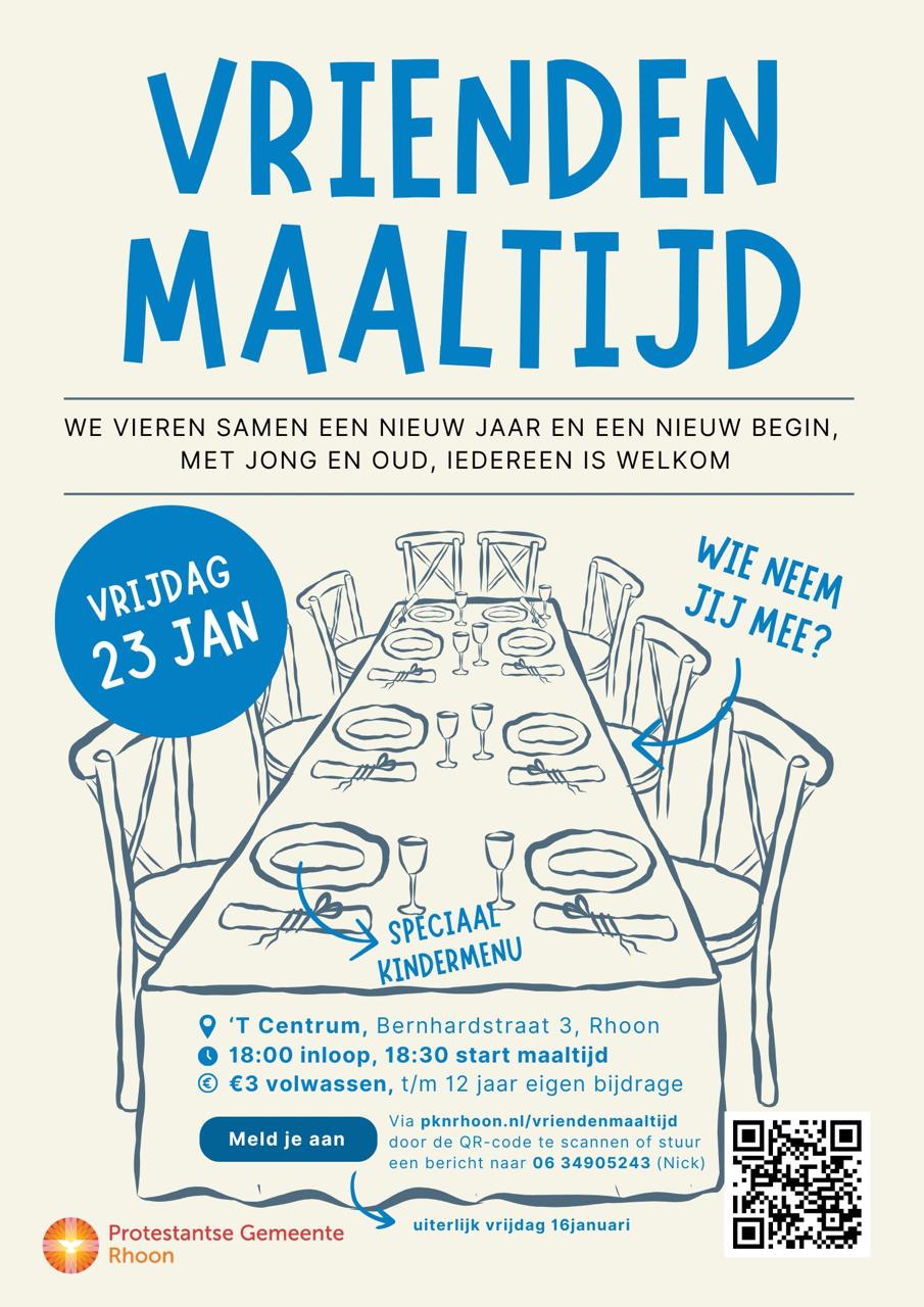 Op vrijdagavond 23 januari schuiven we weer aan tafel tijdens de vriendenmaaltijd in ’t Centrum. Een mooie gelegenheid om samen te genieten van een goede maaltijd en fijne gesprekken. Jong en oud, iedereen is welkom. De deuren gaan om 18:00 open en om 18:30 start de maaltijd. Voor de kids is er een speciaal menu!